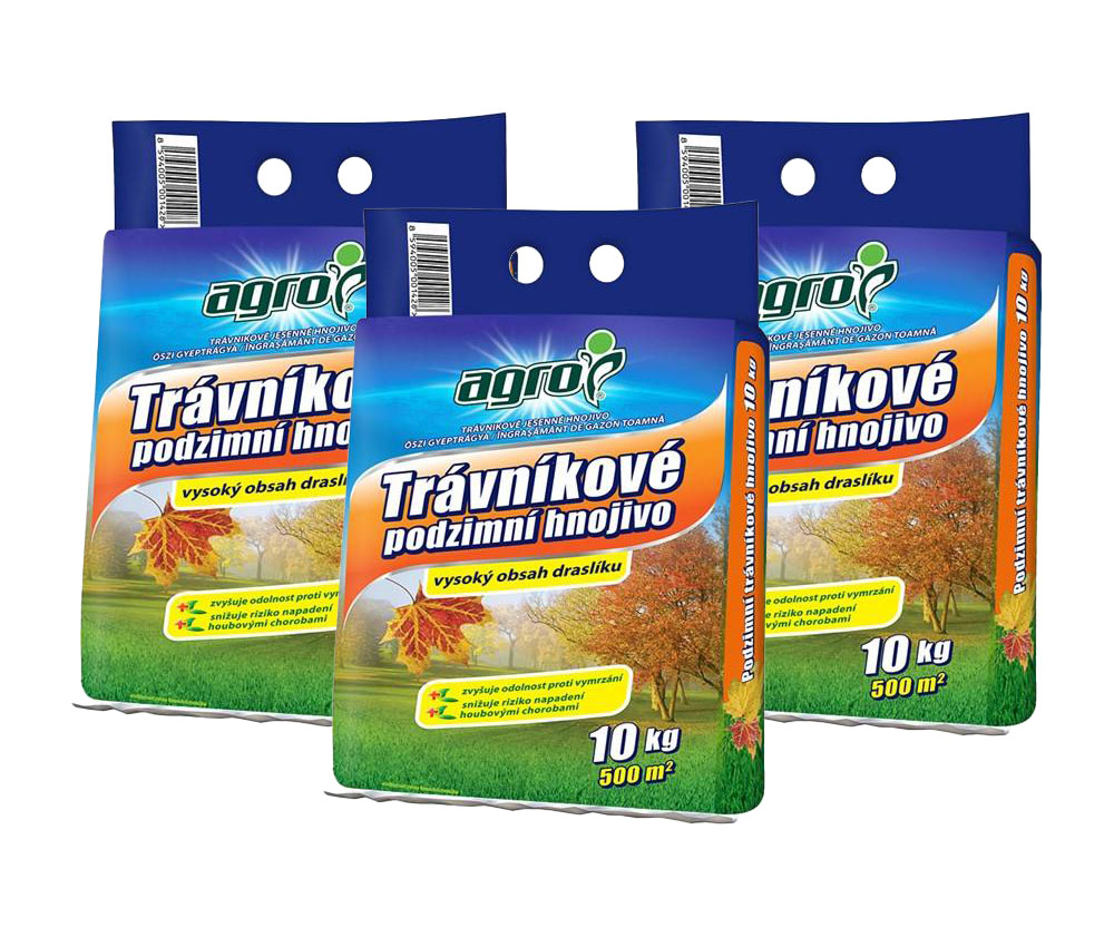 AGRO Jesenné trávnikové hnojivo podporuje lepšie vyzrievanie trávnika pred zimou, zvyšuje odolnosť proti vymŕzaniu a voči suchu, znižuje riziko napadnutia hubovými chorobami a udržuje trávny porast kompaktný a odolnejší voči zošľapu. Vďaka zvýšenému obsahu draslíka podporuje vyzrievanie rastlinných pletív a tvorbu zásobných látok pred zimou. Obsiahnutý horčík výrazne podporuje fotosyntézu a síra je nevyhnutná na tvorbu bielkovín. Obsahuje vysoký podiel horčíka pre sýto zelenú farbu trávnika a vysoký podiel síry nevyhnutnej pre rast a zdravý vzhľad trávnika.